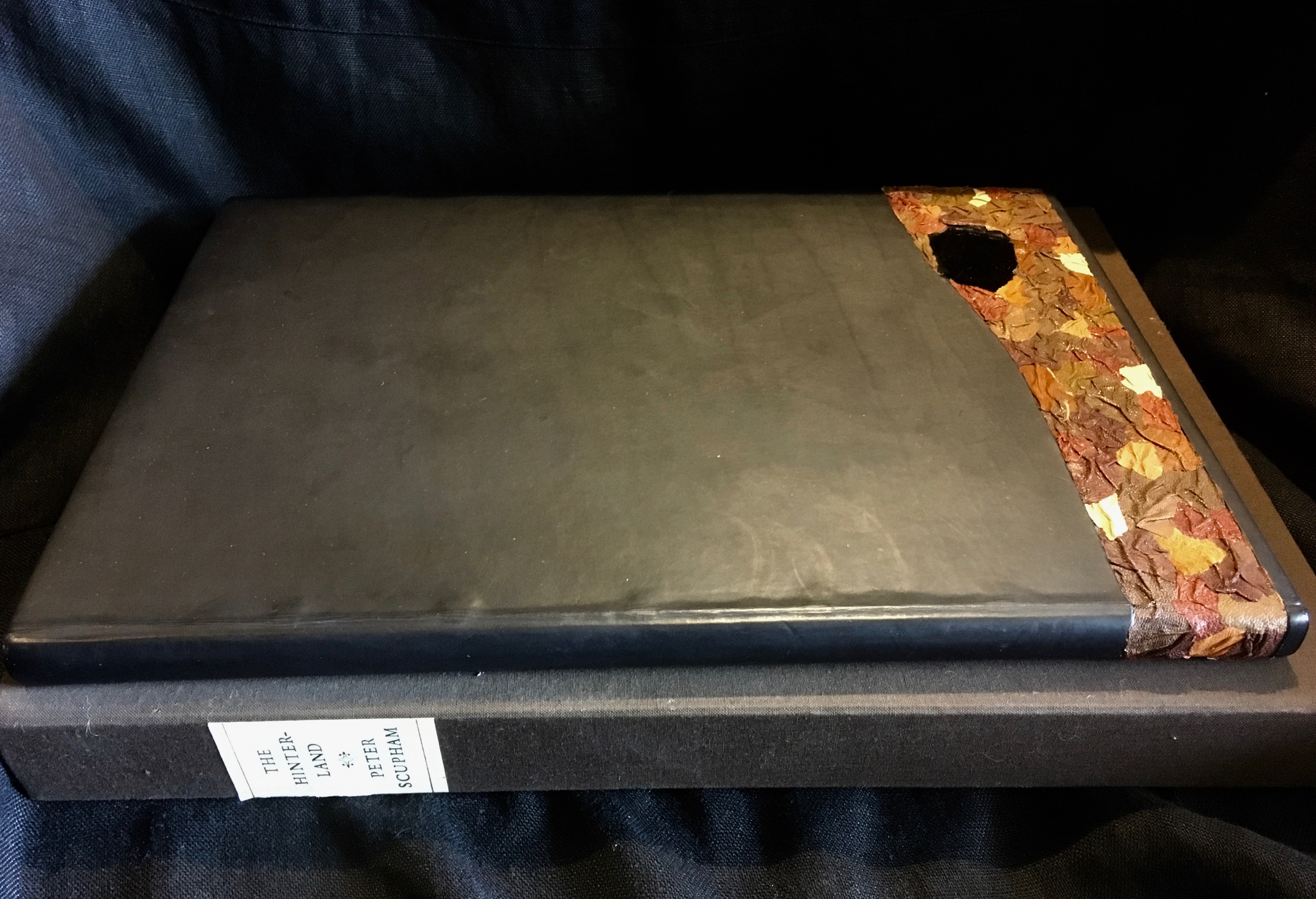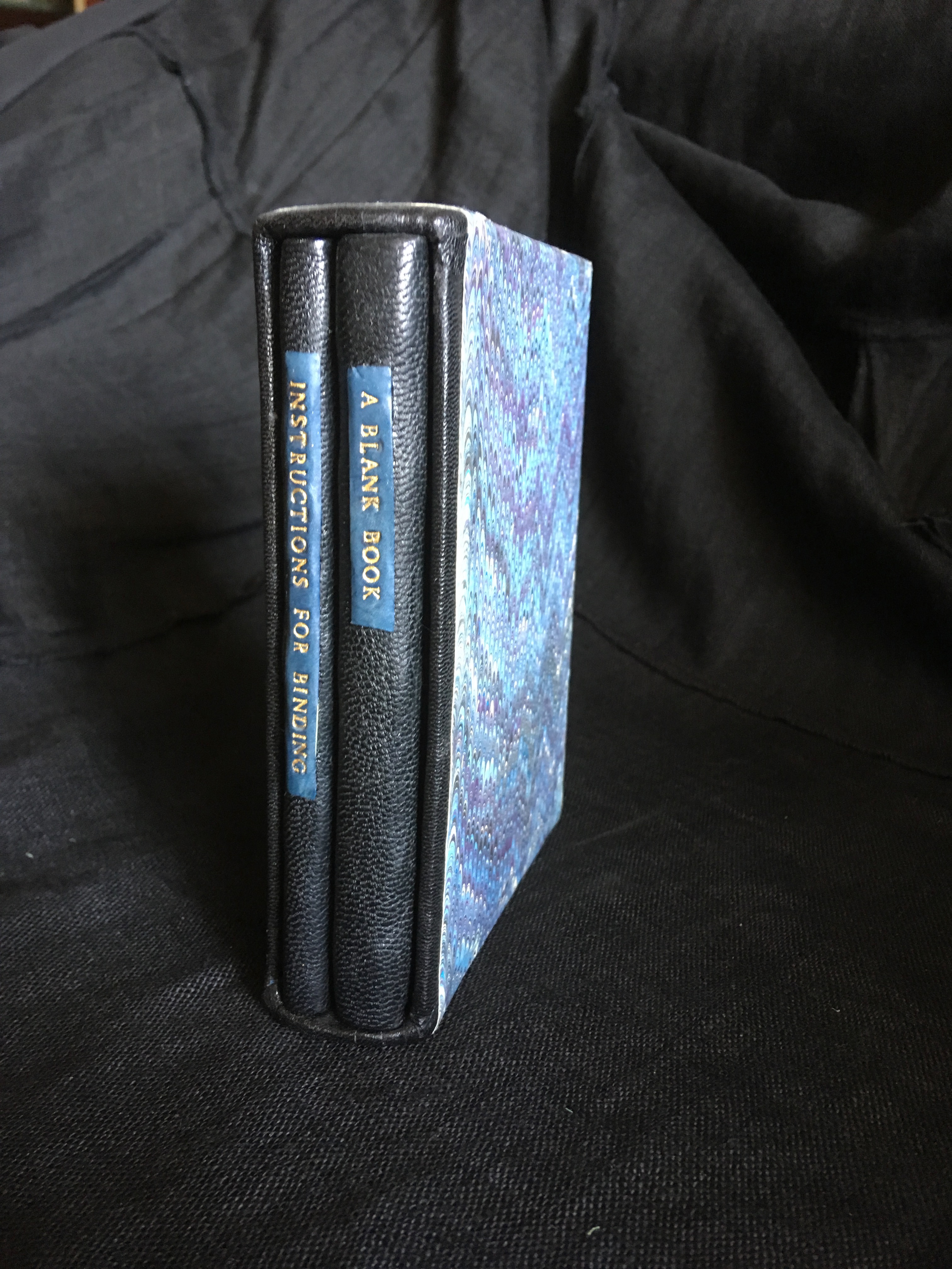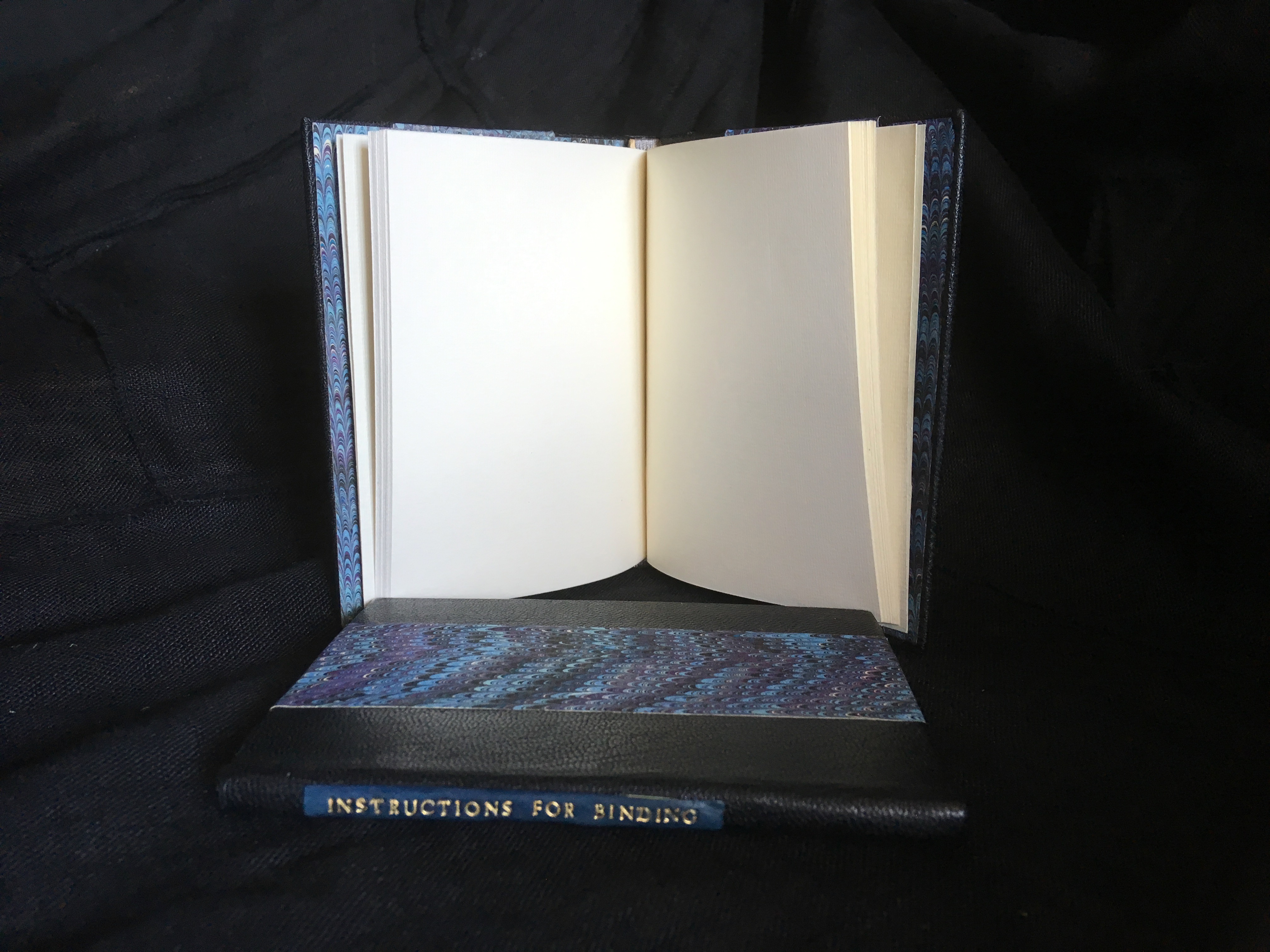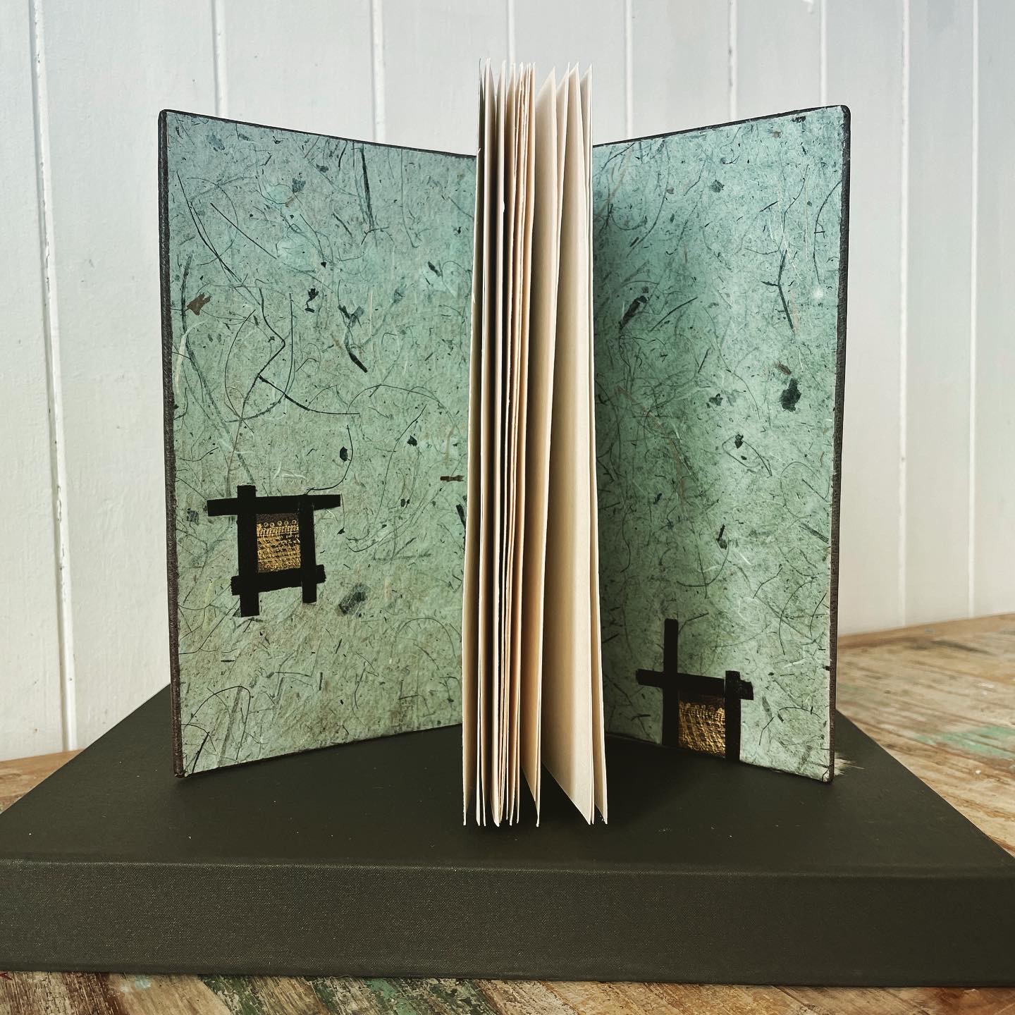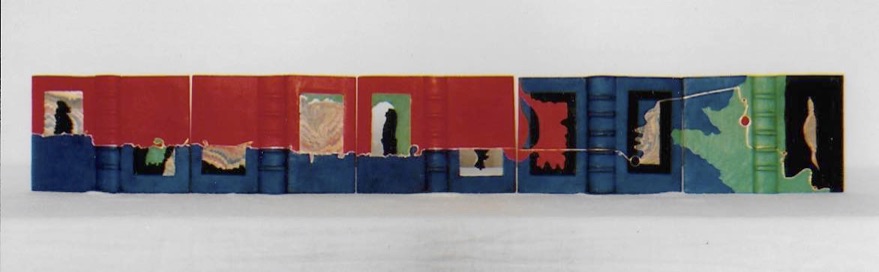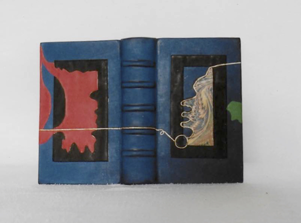 Here are some bookbindings; a shadow box in homage to the poet John Skelton; a mannequin papered over in shredded love poems and an ad for the TLS; work in progress in the form of the poem Instructions for Binding a Blank Book, printed years ago and very slowly being bound in two volumes, of which the first contains the text and the second is blank …