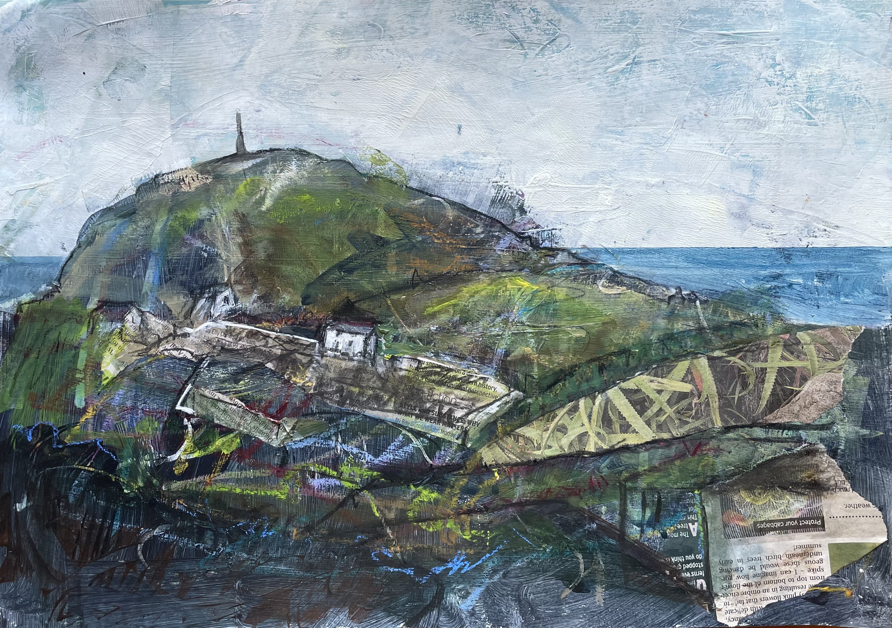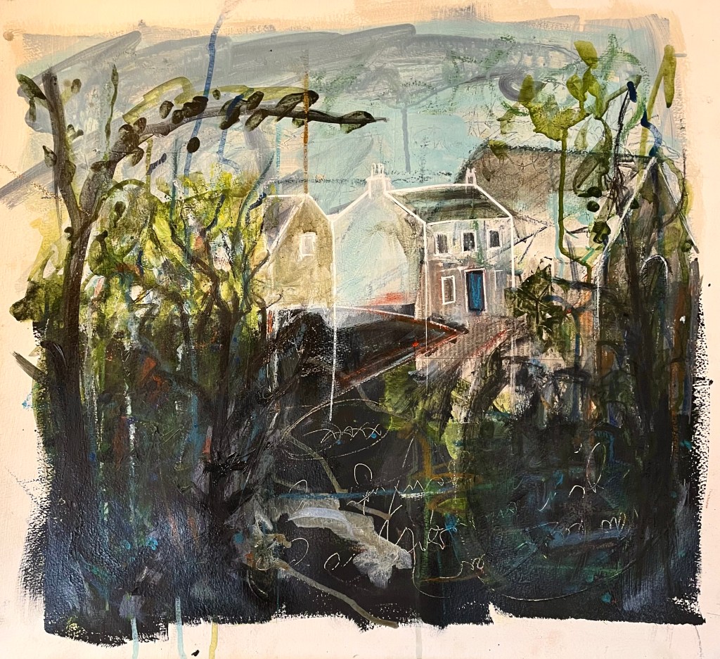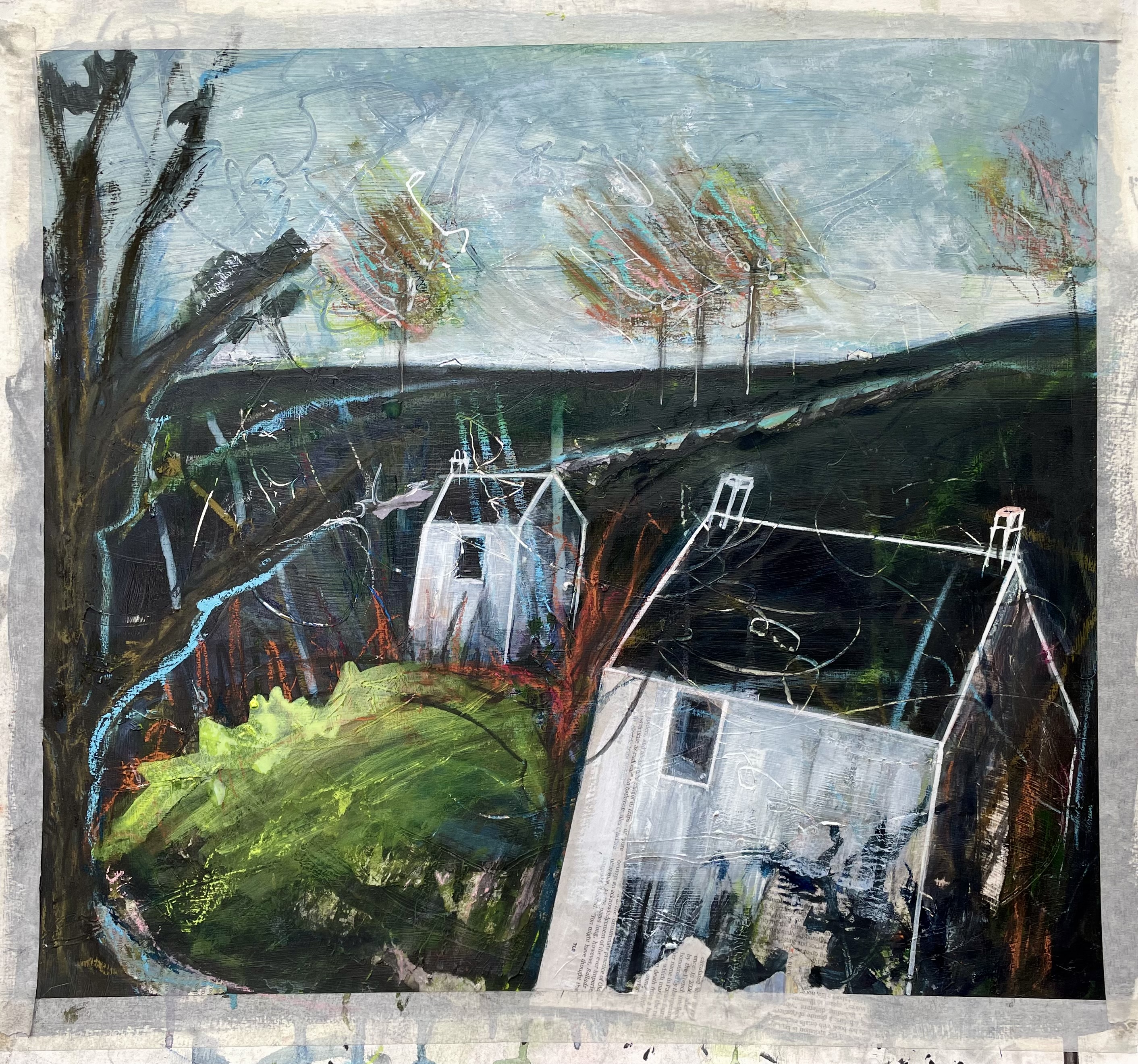 The House on the Hill. Mixed media on paper. 2022.Selva Oscura. Mixed media on paper, approx. 55 x 55 cm. 2023.The Bothy. Collage and mixed media on canvas. 2024.Bethany Place. Collage and mixed media on canvas. 2024. Perfect Way. Collage and mixed media on paper, 54 x 50 cm. 2023.The Wood and the Trees. Mixed media on paper, approx. 55 x 50 cm. 2023.The Tree Houses. Collage and mixed media on paper, 43 x 44 cm. 2023.Cot Song. Mixed media on paper, 52 x 48 cm. 2023. Cape Dwelling. Collage and mixed media on paper, 42 x 29 cm. 2024.Rock Garden. Collage and mixed media on paper, 42 x 29 cm. 2024.