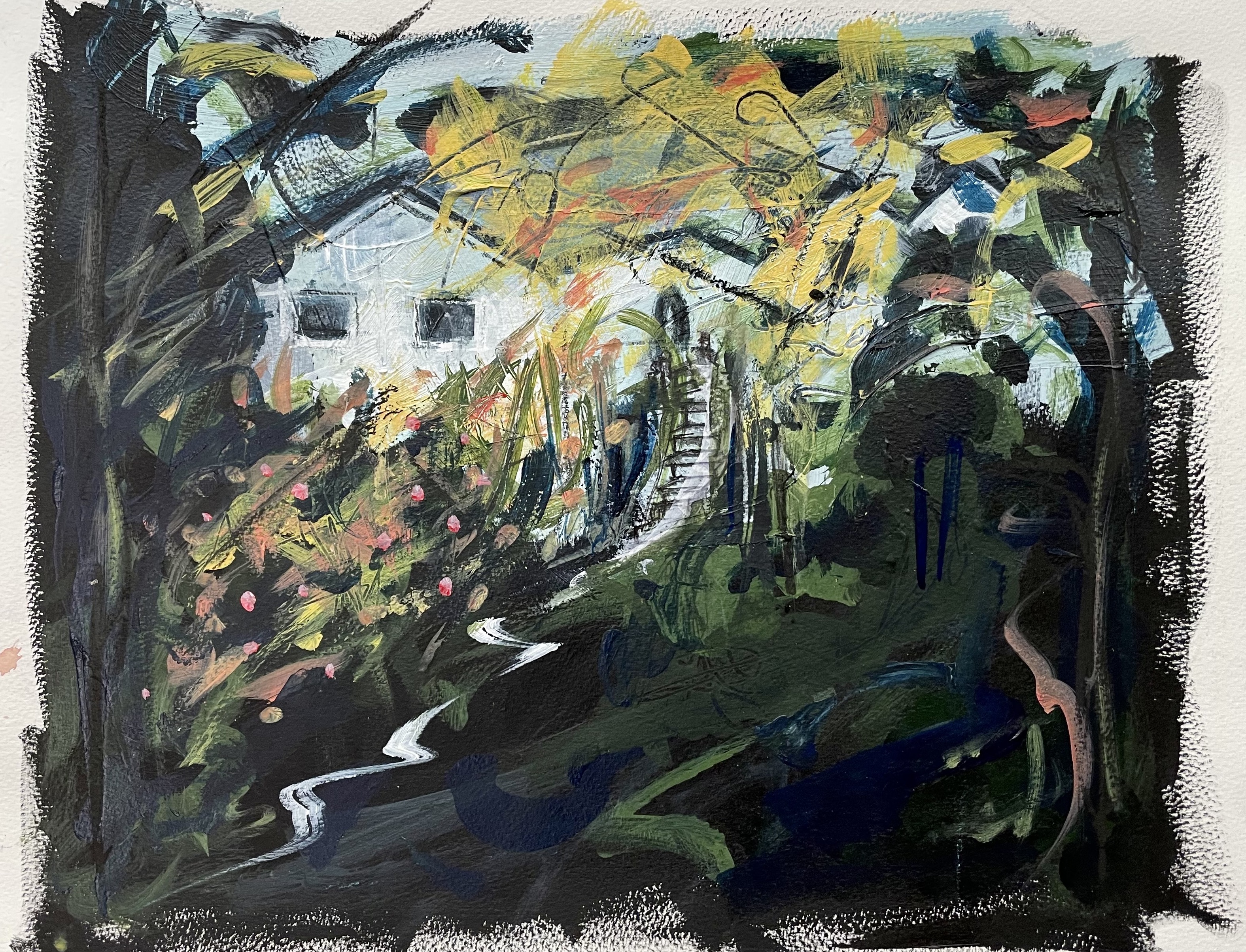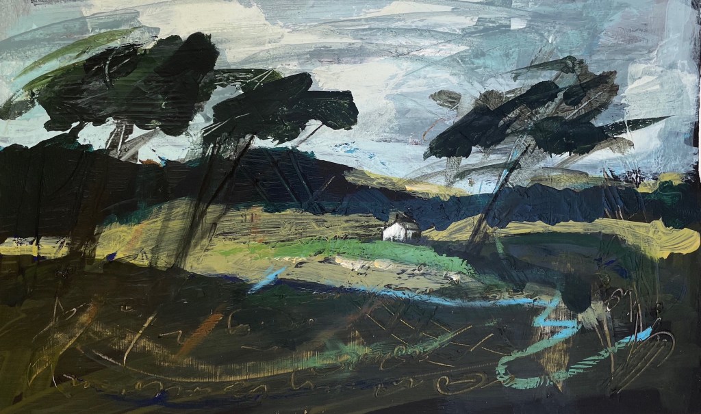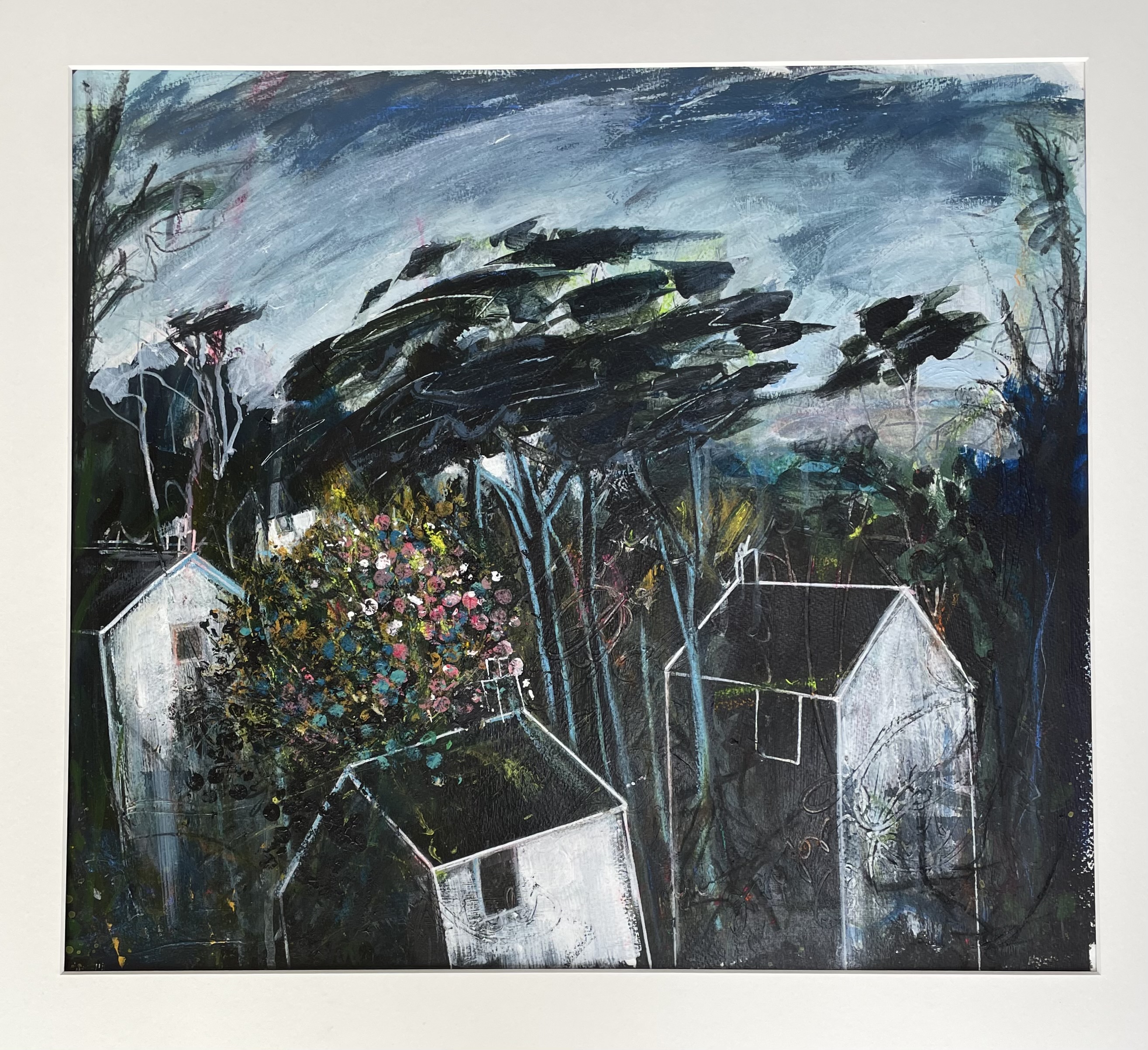 The House on the Hill. Mixed media on paper. 2022.Selva Oscura. Mixed media on paper, approx. 55 x 55 cm. 2023.The Bothy. Collage and mixed media on canvas. 2024.Bethany Place. Collage and mixed media on canvas. 2024. Perfect Way. Collage and mixed media on paper, 54 x 50 cm. 2023.The Wood and the Trees. Mixed media on paper, approx. 55 x 50 cm. 2023.The Tree Houses. Collage and mixed media on paper, 43 x 44 cm. 2023.Cot Song. Mixed media on paper, 52 x 48 cm. 2023. Cape Dwelling. Collage and mixed media on paper, 42 x 29 cm. 2024.Rock Garden. Collage and mixed media on paper, 42 x 29 cm. 2024.